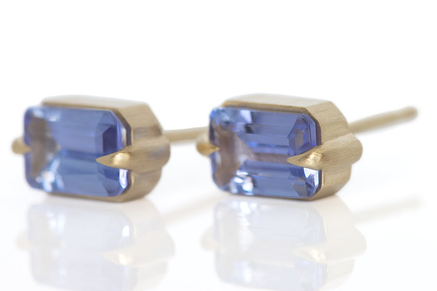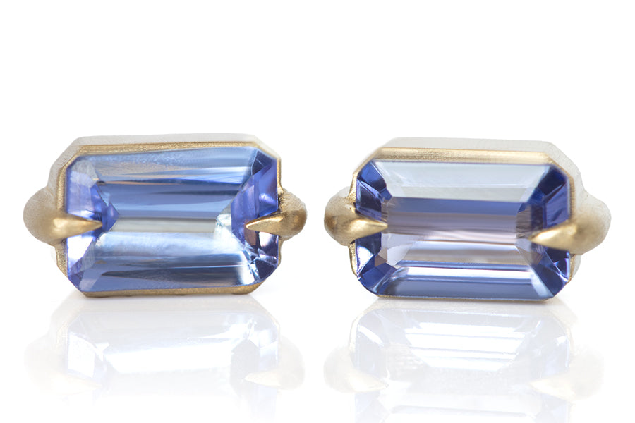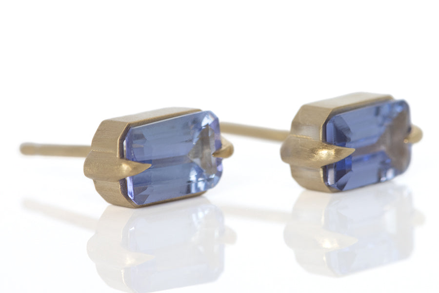 These ultraviolet beauties are 6x4mm tanzanites set in a modern two prong eagle claw setting stud. Perfect every day classics. Made in 14k yellow gold. Hand made in Los Angeles. (0.60 total carat weight)