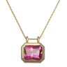 This technicolor beauty features a large 2.2ct radiant cut juicy pink tourmaline set in a 14k yellow gold heavy bezel basking with a double jump ring slider. Set on a 20" chain, perfect for layering or wearing as a fabulous centerpiece. Hand made in Los Angeles and one of a kind.