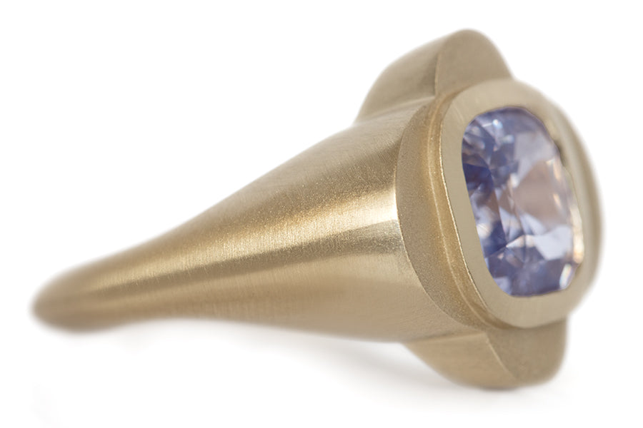 2.22ct cushion-cut lavender sapphire set in a gothic quatrefoil signet design, hand-crafted in 14k yellow gold. The brushed satin finish highlights the stone’s soft violet tone within the bold, architectural silhouette. One of a kind, made in size 7 Handmade in Los Angeles. Please allow 2–3 weeks for delivery if resizing is requested.
