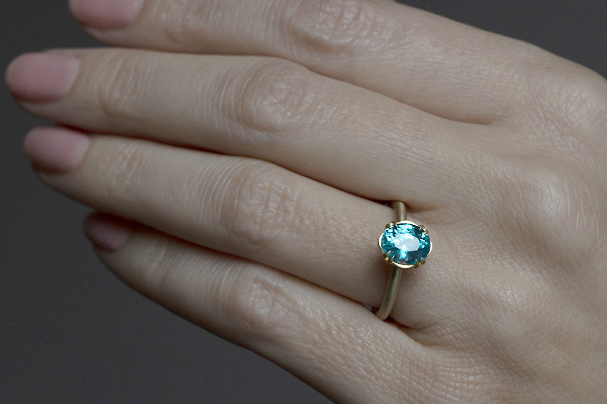 This sparkling 2.3ct Blue Zircon is flanked by a Victorian style bezel with eagle claw prongs creating a structural and feminine setting. Made in 14k yellow gold in size 6.5. This beauty was hand made in Los Angeles and is one of a kind. If ordering a different size please allow 2-3 weeks for delivery.
