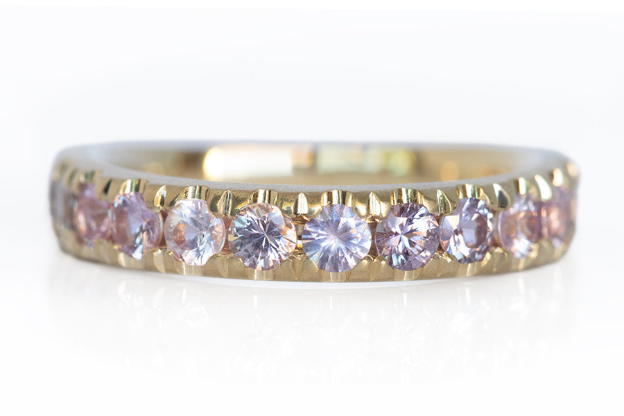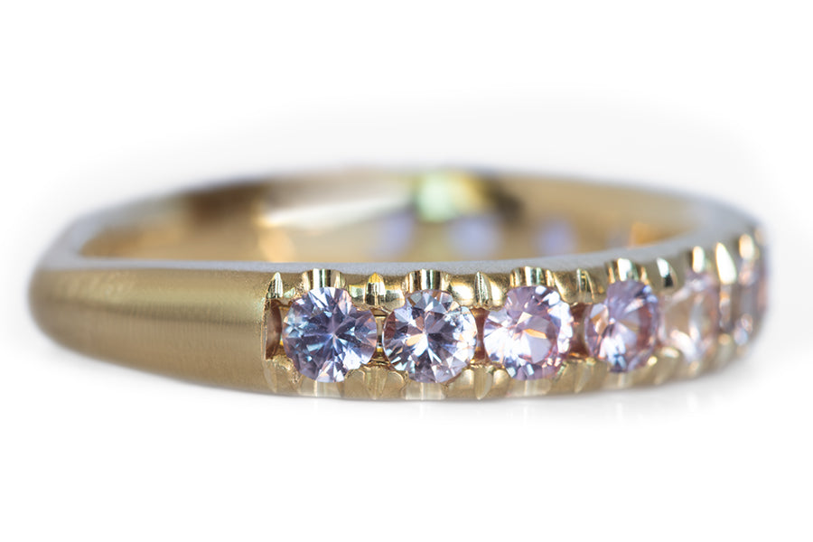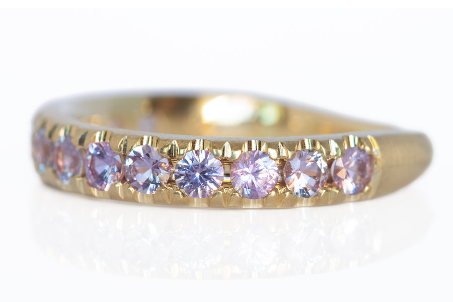 A soft veil of color defines these velvety hued sapphires, drifting between shades of pink and purple. Each stone is U pavé set in a euro band of 14k yellow gold with a soft satin finish. This piece is designed for durability and intended for daily wear. It stacks beautifully yet stands beautifully on its own. Available in size 6.5, please allow up to two weeks for alternate sizing. Handmade in Los Angeles. One of a kind.