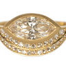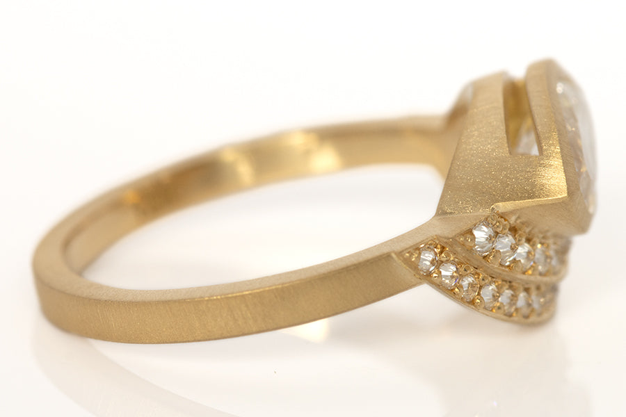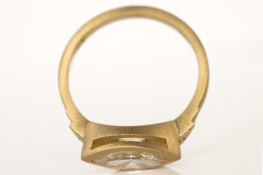 The center stone on this beautifully odd diamond solitaire is a 1.06 carat marquise cut diamond ethically mined in Canada. It is set in a sculptural 18k yellow gold bezel and framed by an asymmetrical double stepped halo of inverted natural white diamonds totaling 0.21 carats. The inverted setting adds a bright faceted texture that curves around the marquise and emphasizes its long elegant shape. Hand made in Los Angeles and one of a kind. Available in size 6.5. If ordering another size please allow two weeks for delivery.