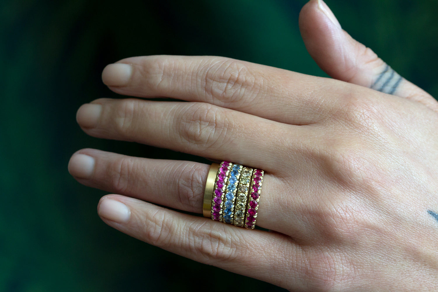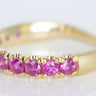 Fuchsia. Magenta. Hot pink. Whatever you want to call this incredibly vibrant hue of rare pink sapphire, it's sure to add a major punch of color to your stack. Weighing in at 1.38ct this hefty beauty features sapphires measuring 2.6 mm each set in 14k yellow gold. Hand made with lots of love in Los Angeles. This piece is available in size 6.5, please allow 2-3 weeks for delivery if ordering another size.