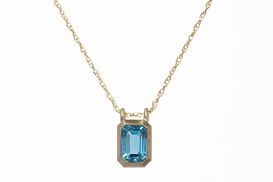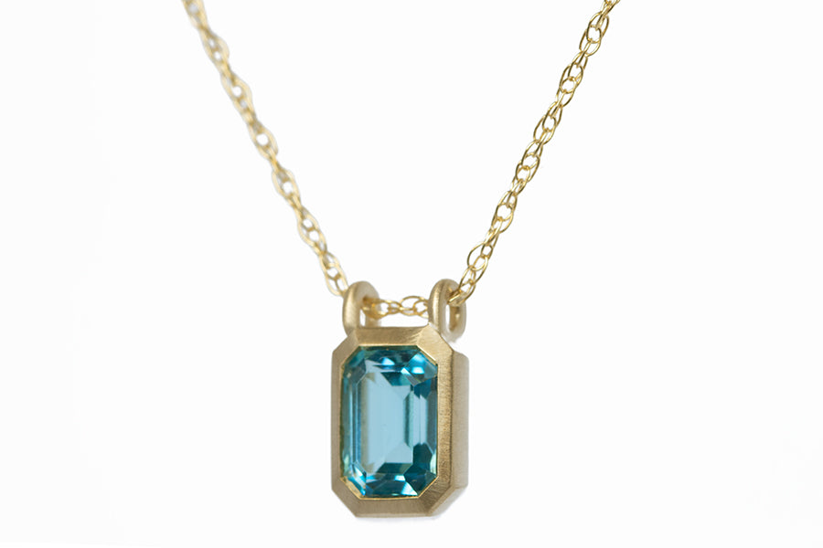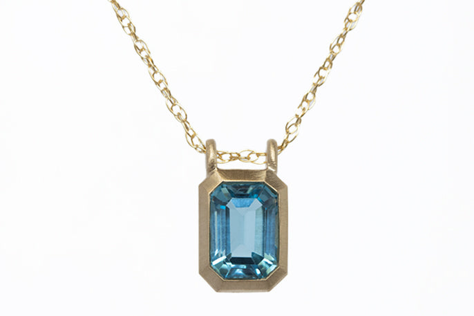This petite London blue topaz gemstone measure 7x5mm and is set in a very architectural bezel set pendant in 14k yellow gold with a satin finish. Available with a 14k yellow gold wheat chain in 16" or 18" length. Hand made in Los Angeles. Versatile and vibrant this piece is perfect for every day wear!
