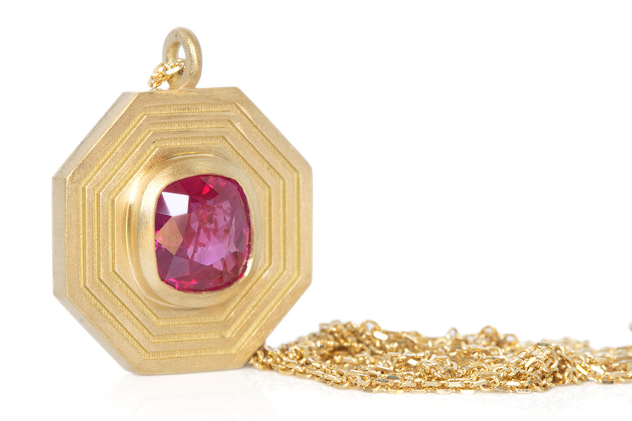 This stunner is a 1ct cushion cut Burmese ruby set in an octagonal deco pendant in 18k yellow gold. This juicy center stone is a rare unheated ruby. The chain is 18" diamond cut link with a lobster clasp. Hand made in Los Angeles and one of a kind.