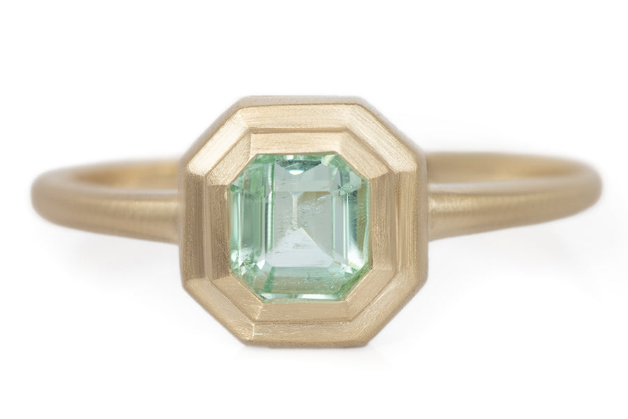This 0.65ct pale mint Asscher cut emerald with natural jardin is set in a stepped 14k yellow gold bezel with a satin finish. The band tapers subtly for a clean, balanced profile. Handmade in Los Angeles and one of a kind, this ring is simple, modern, and quietly romantic. Available in size 6.5, if ordering another size please allow 2 weeks for delivery.